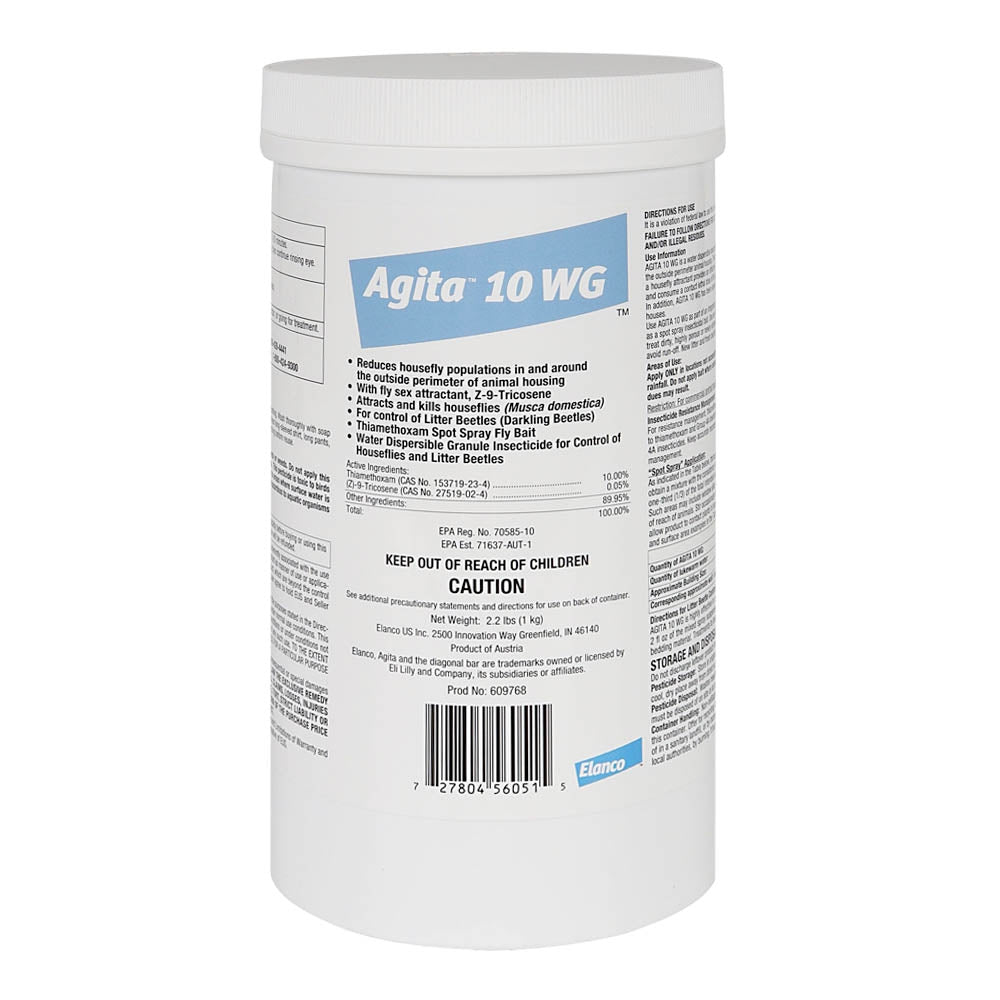 Agita 10 WG is a water dispersible granule insecticidal bait formulation for the reduction of housefly populations in and around the outside perimeter of animal housing. The combination of a neonicotinoid insecticide, with both contact and stomach modes of action and a housefly attractant provides an effective fly bait formula that encourages both male and female houseflies to remain in treated areas and consume a contact lethal dose of the bait. Use spray suspension immediately after mixing. Contains Z-9-Tricosene and Thiamethoxam.