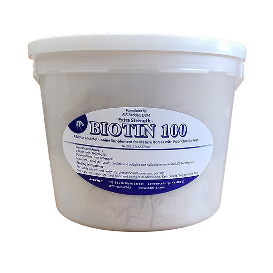 Extra Strength Biotin 100™ was formulated by Dr. Ric Redden over 25 years ago for his personal podiatry cases. Biotin has long been noted as a supplement that aids natural keratinization process. Hair and horn (hoof capsule) are constantly undergoing growth, maturation and keratinization. Biotin 100 has become the horseman’s choice. Feeding 1 (.05 lb) scoop per day delivers 100 mg of Biotin and 50 mg of DL-Methionine.